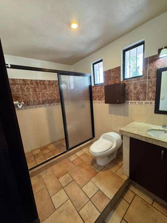 BEAUTIFUL HOME Spacious two-story house featuring a versatile ground floor with one bedroom or studio, a full bathroom, a living and dining area whit air conditioning, a kitchen, a backyard with a newly refurbished jacuzzi, and a laundry area. The second floor offers three air conditioned bedrooms. The master bedroom includes a walk-in closet and an en-suite bathroom, while the other two bedrooms share a bathroom and have access to a linen closet. The rooftop boasts a large terrace, perfect for enjoying mountain views, stunning sunsets, and breathtaking full moon nights. Additional features include two parking spaces and enhanced security with an electric fence.