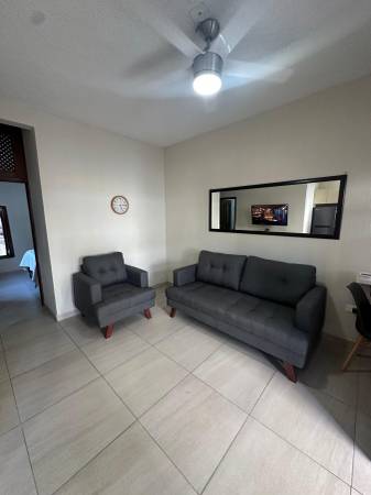 Cozy and fully equipped apartment with 1 bedroom 🛏️, 1 bathroom 🚿, A/C ❄️, sofa 🛋️, Smart TV 📺, fridge 🧊, cutlery 🍴, and a comfy double bed.