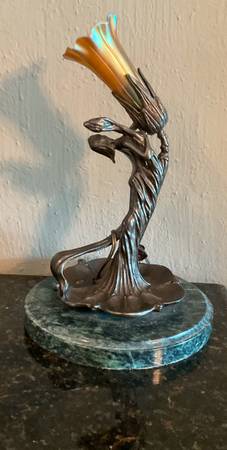 This bronze lamp is handmade and cast in the traditional Lost Wax casting process. This bronze lamp is handmade and cast in the traditional Lost Wax casting process. This insures a quality sculpture that may be passed down from generation to generation. All lamps are wired for regular household outlets. The flowers have a translucent glass shade which gives off a pleasant glow. This bronze lamp will last forever. It is made to will look great wherever you place it with little or no maintenance. This is an excellent quality bronze masterpiece for impressive display in home, office, cabins or as gifts. Our quality bronze sculpture can proudly be passed down from generation to generation.