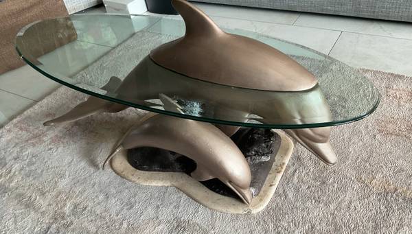 Goldish color Dolphin coffee table with glass top and creamy color marble base. I’m not sure what the dolphin and the bronze color part is made off but it’s very heavy.