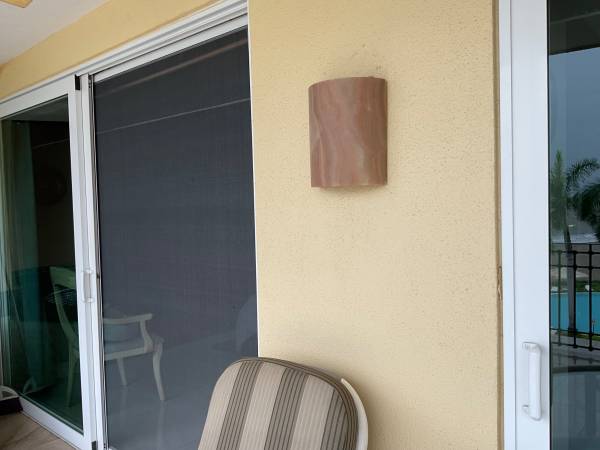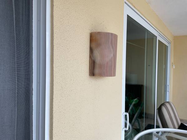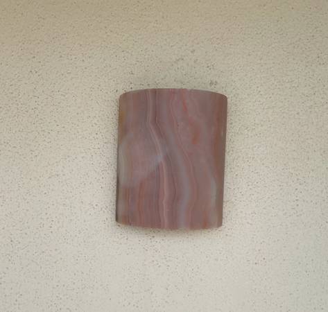 Half Round Honey Onyx Lamp Cover. This fixture is perfect for garage lighting, outdoor walls, backyard and patio lighting. It weighs over 13 lbs.