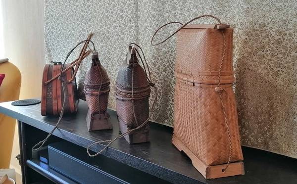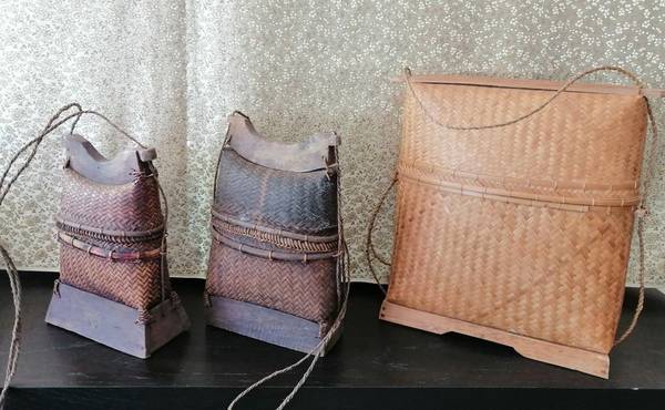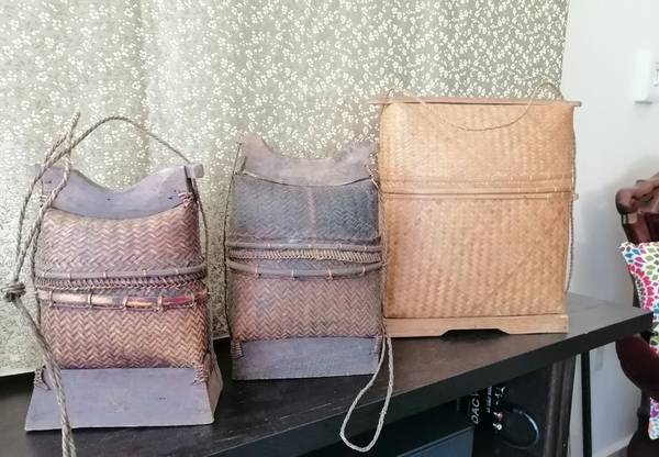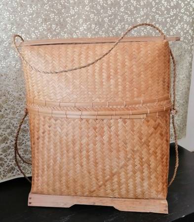 Collection of vintage handmade Indonesian bags. Vintage Indonesian Lombok woven rattan baskets Beautiful basket design with hemp straps. One newer Indonesian Lombok replica Selling as a set only —...